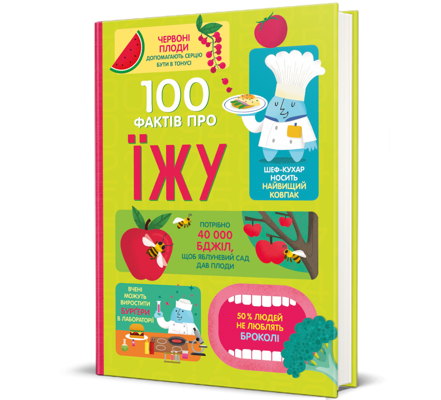 «100 фактів про їжу» —дитяча енциклопедія про їжу, її технології виробництва, а також неочікуванні відкриття. Всередині не лише цікаві факти про продукти, які ми вживаємо у їжу, історію страв чи дивні смакові вподобання історичних особистостей, а й потрібна базова інформація про поживні речовини, вітаміни, особливості тих чи інших продуктів. Із книжкою «100 фактів про їжу» читачі зможуть дізнатися про свій організм, про корисну та шкідливу їжу, а також про те, як їжа може змінити світ. Видання дасть змогу читачу дізнатись, чому зробити желе з ківі неможливо, скільки мільярдів чашок напоїв щодня випивають люди, а також, які прянощі дорожчі за срібло і золото. «100 фактів про їжу» сприятиме свідомому ставленню до харчування. Гастроексперткою українського видання стала Аврора Огородник. Наприкінці посібника є словничок з тематичними термінами, вжитими у книжці, а також покажчик. «100 фактів про їжу» — продовження серї «100 фактів про…», у якій уже вийшли видання про космос, історію, комп’ютери і програмування.